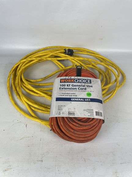 One yellow extension cord and one new WorkChoice 100ft general use extension cord.