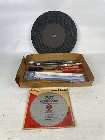 This auction is for a box of miscellaneous saw blades. Included is a Skokie 7-7/1" crosscut saw blade, a Warrior 14" cut-off wheel, and various other saw blades of different types and brands.