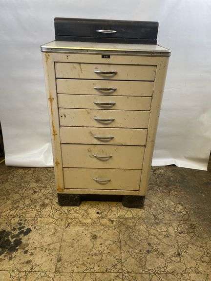 Metal rolling cabinet with drawers. The cabinet is 36 inches tall and 22 inches wide. It comes with an additional top box.