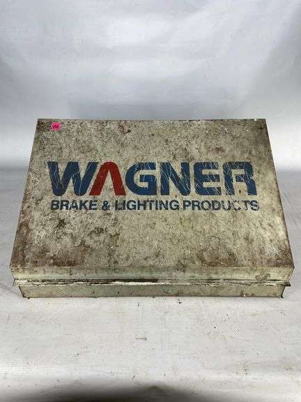 Wagner brake and lighting products metal display with all contents inside. Includes bulbs and other lighting components. New stock, old inventory.