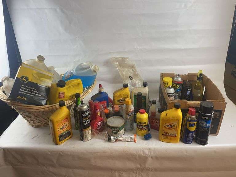 Oil and lubricants lot consists of John Deere air filter for lawn mower, antifreeze, oils, brake fluid wd-40, windshield washer fluid, stp gas treatment, transmission fluid and so much more