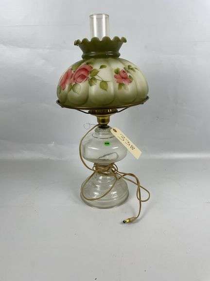 Clear glass lamp with beautiful hand painted green and pink glass shade.