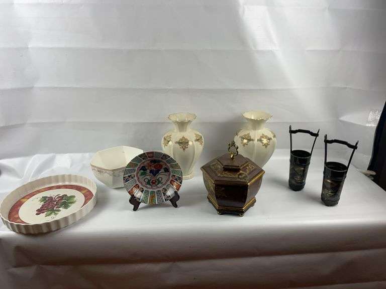 This lot consist of 9 items. 2 beautiful vases, plate and plate stand and much more.