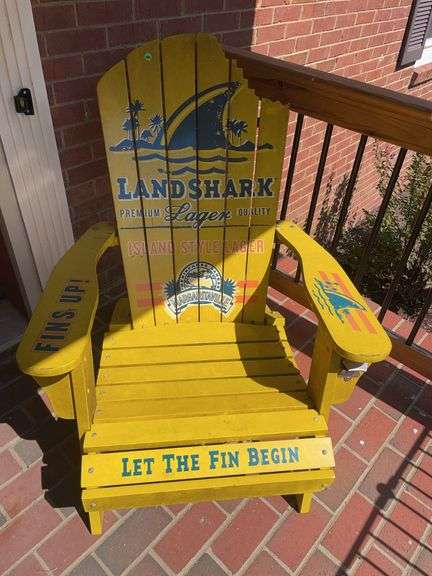 Metal pink flamingo chair and a really cool landshark margaritaville Adirondack chair. Also one flower pot.